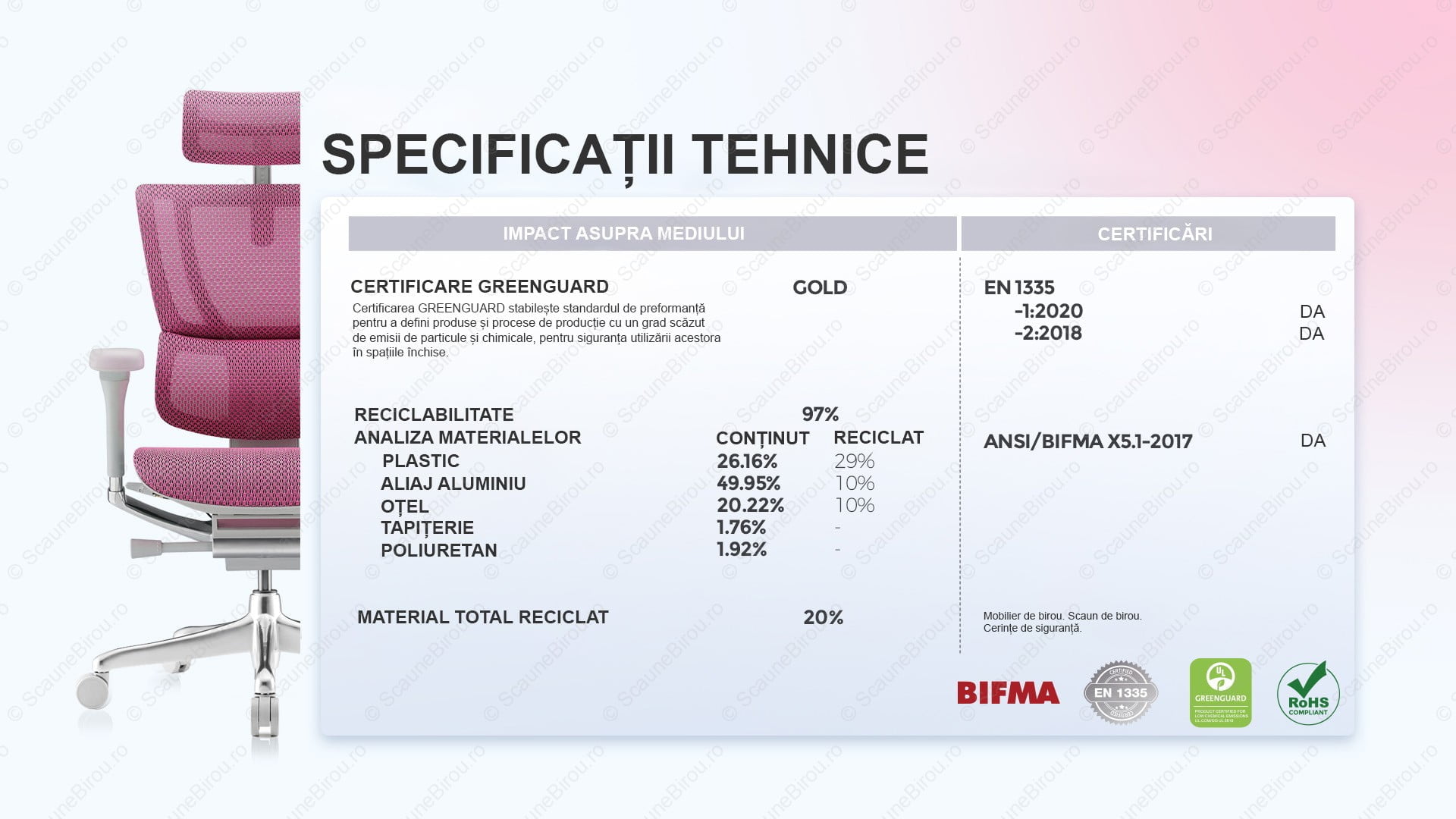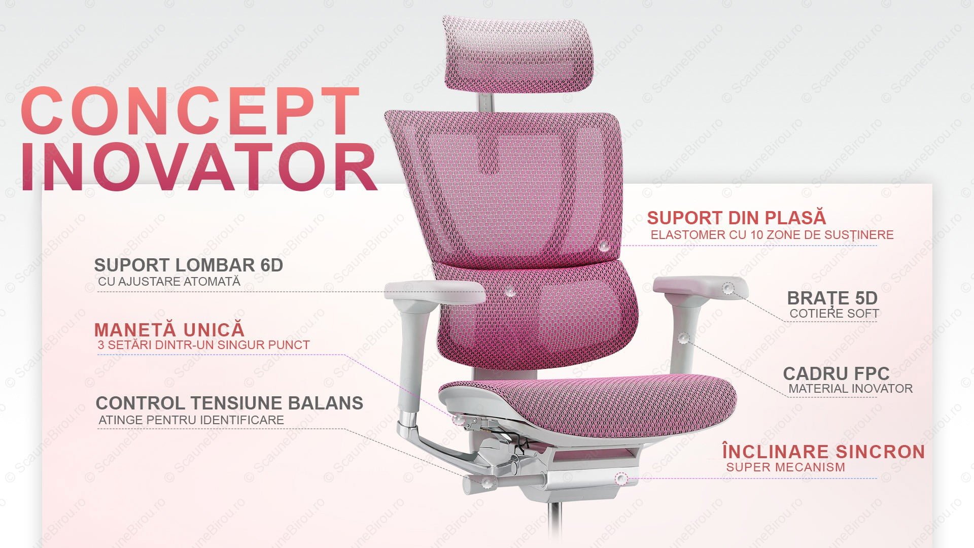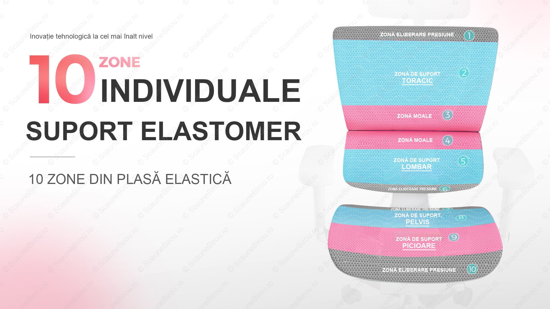 ✓ Tapițeria este confecționată din plasă elastică (Elastomer) ce oferă suport optim pentru toate zonele corpului.