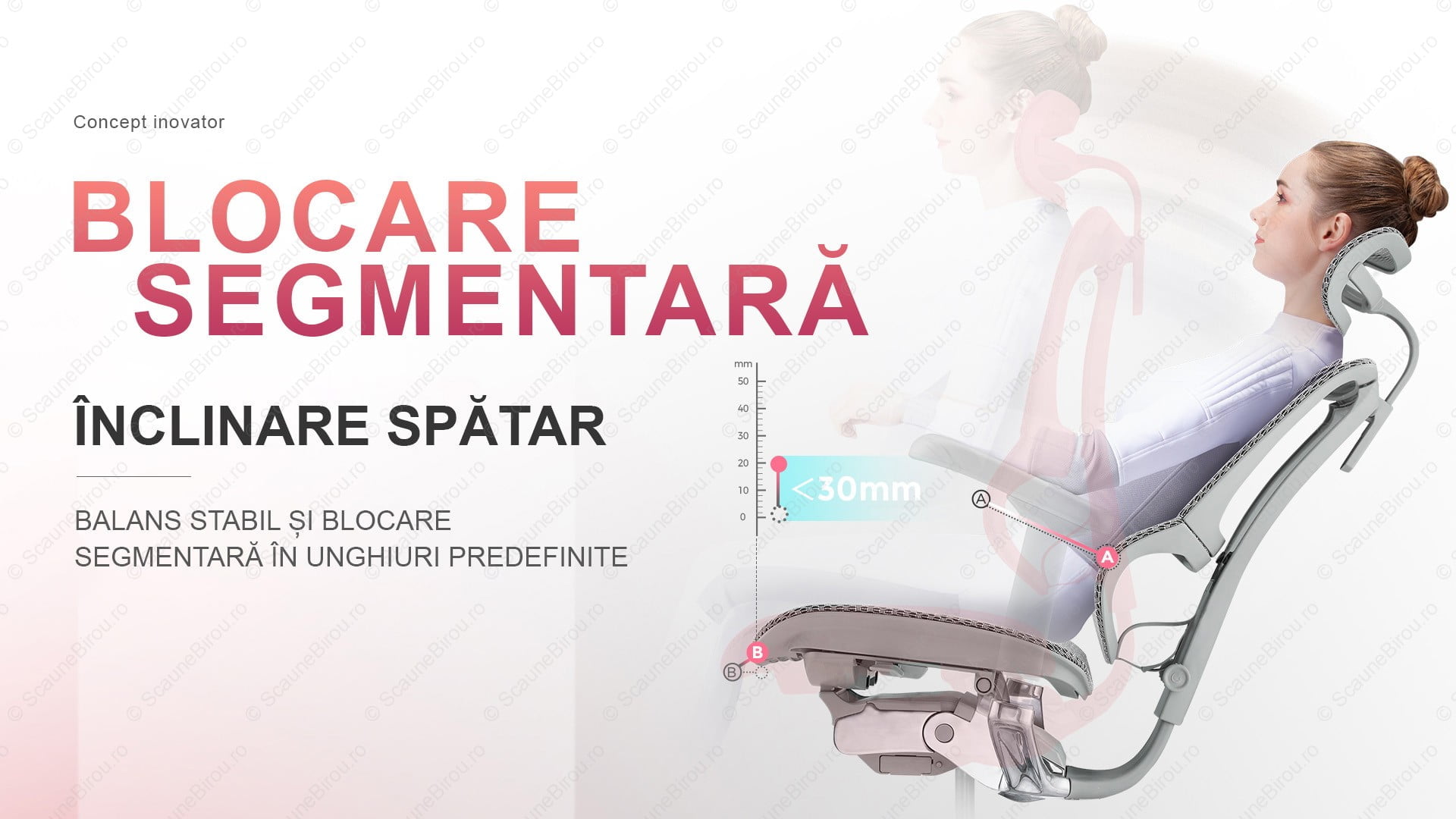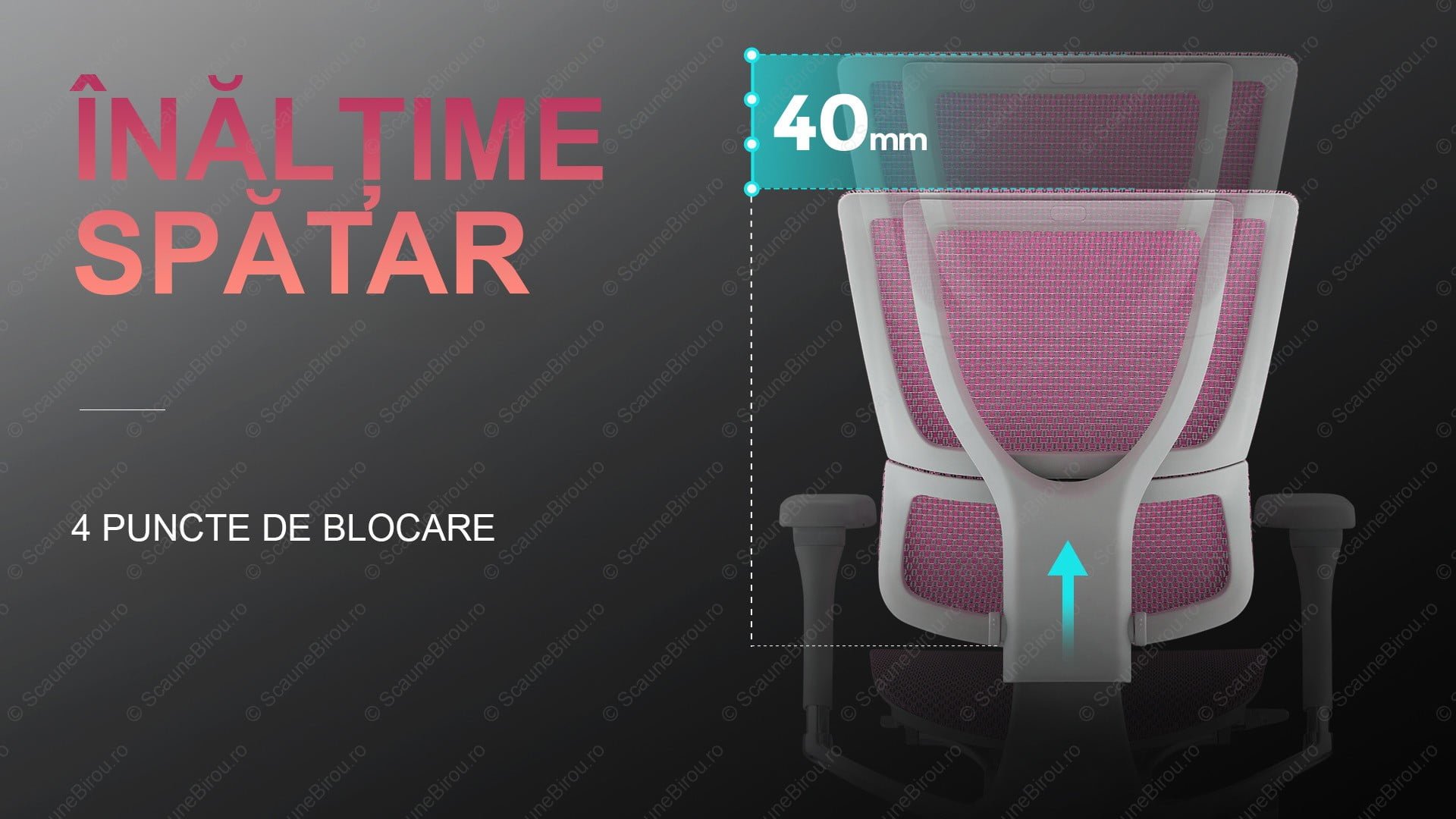 ✓ Spătarul poate fi reglat pe înălțime în 4 poziții de blocare, având o cursă de 40 mm, pentru a obține postura corectă și susținere optimă.