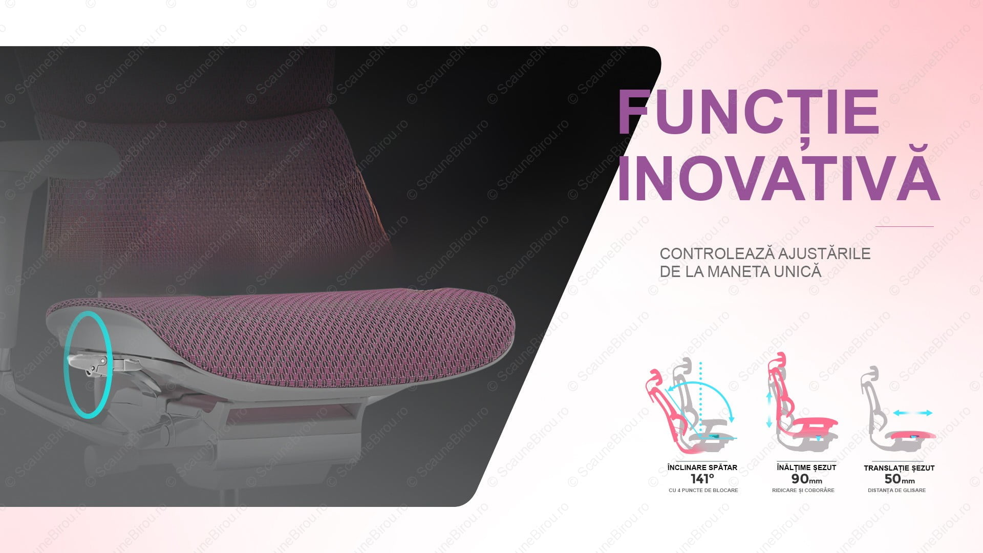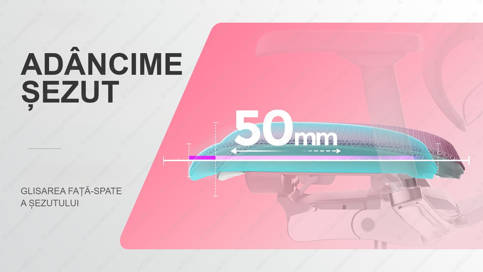 ✓ Șezutul beneficiază de translație (reglaj adâncime) având o cursă de 50 mm. Se va obține astfel o mai bună susținere pentru persoanele înalte.