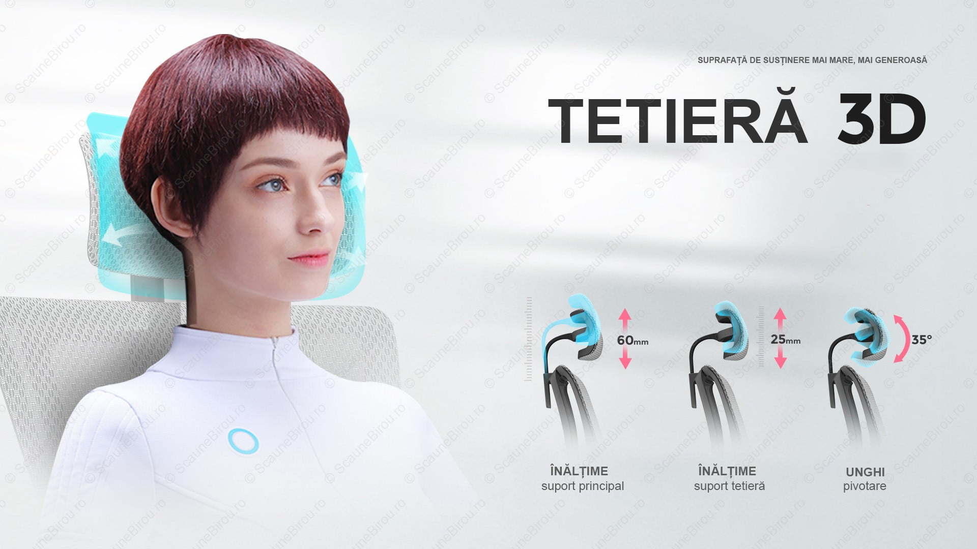 ✓ Cu ajutorul reglajelor pe înălțime și în unghi orice utilizator poate obține susținerea cervicală perfectă.