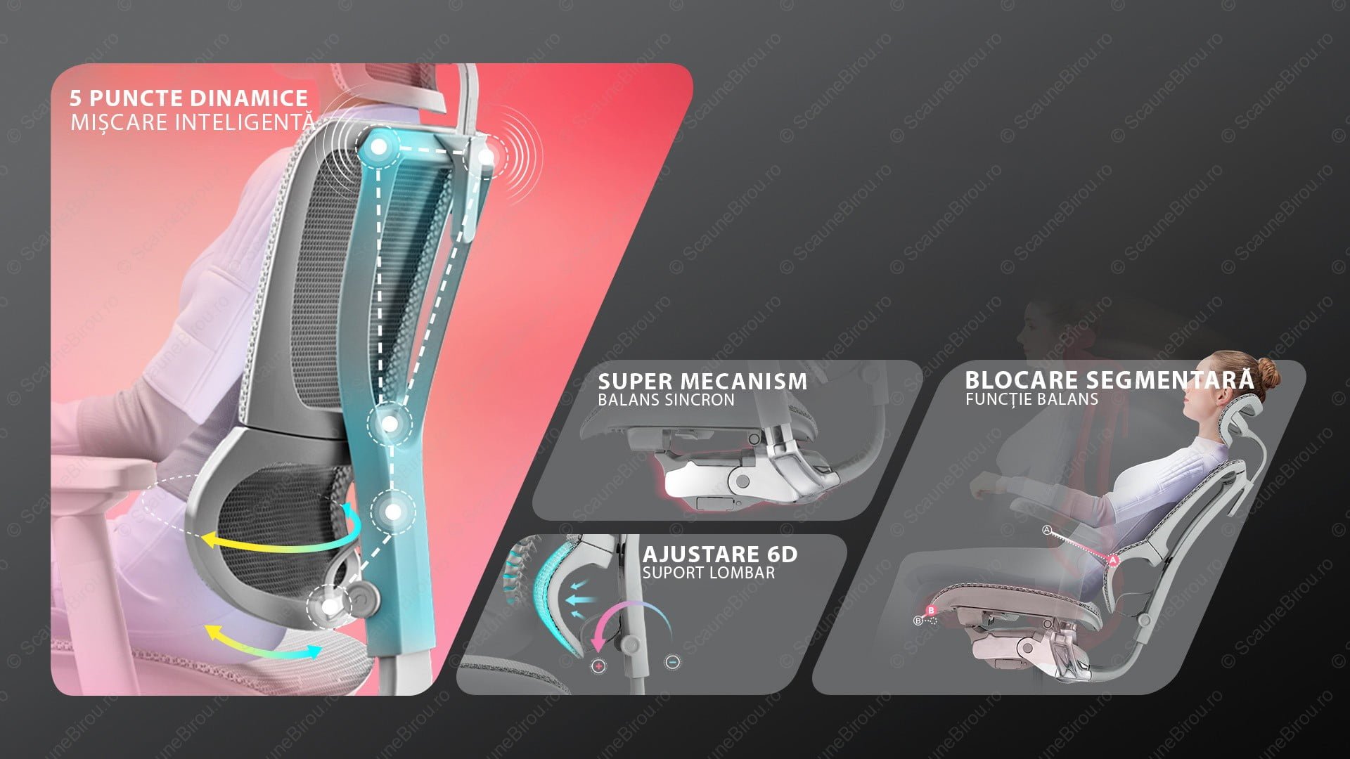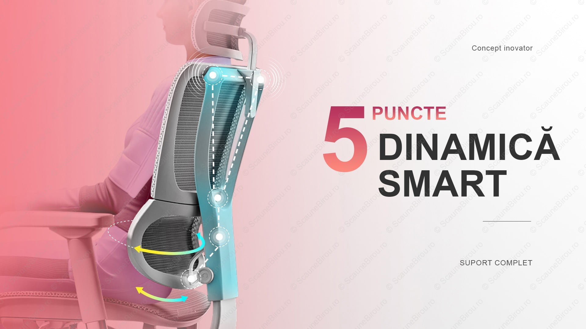 ✓ Suportul lombar este automat dar în același timp este și reglabil, pe înălțime sau ca nivel de duritate (presiune, forța de „suspensie” a zonei inferioare).