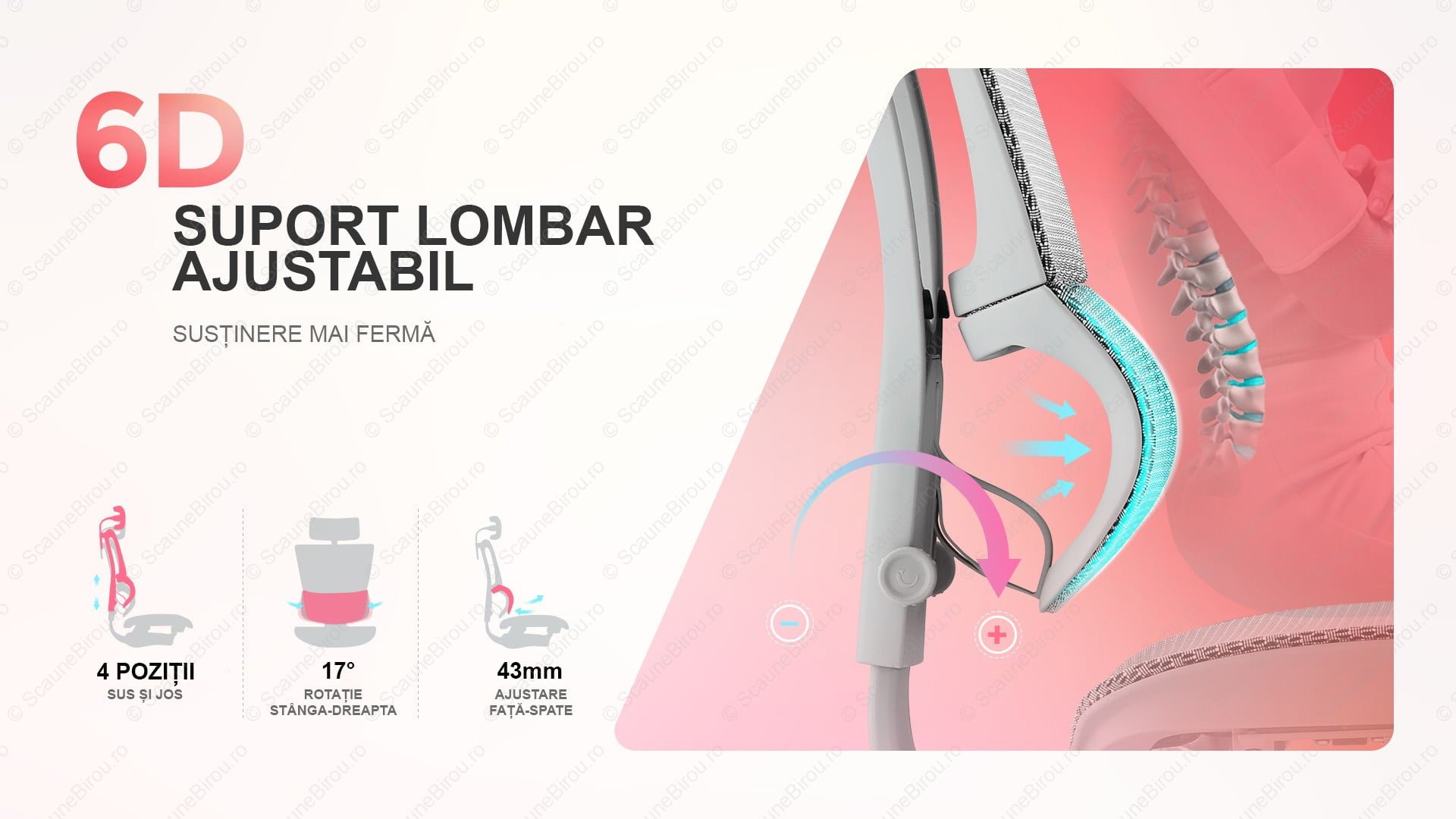 Suport lombar reglabil 6D, cu duritate ajustabilă