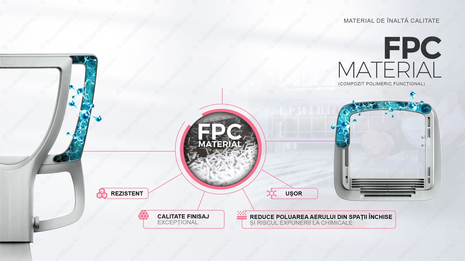 ✓ FPC este folosit în premieră de producătorul scaunelor Ergohuman, Mirus, Pofit, și altele, acesta fiind de altfel un material compozit dezvoltat exclusiv pentru aceste modele. FPC este rezultatul multor ani de cerecetare, dezvoltare și teste de performață.